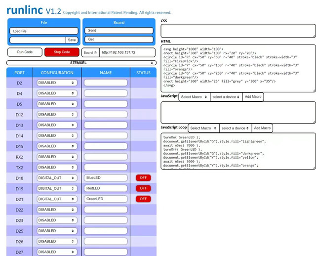• Works with runlinc IDE. 2 lines of runlinc EASY CODING compare to 120 lines of Difficult Coding to make an ALARM WEBPAGE with 2 buttons to turn ON and OFF buzzers, lights to scare intruders.